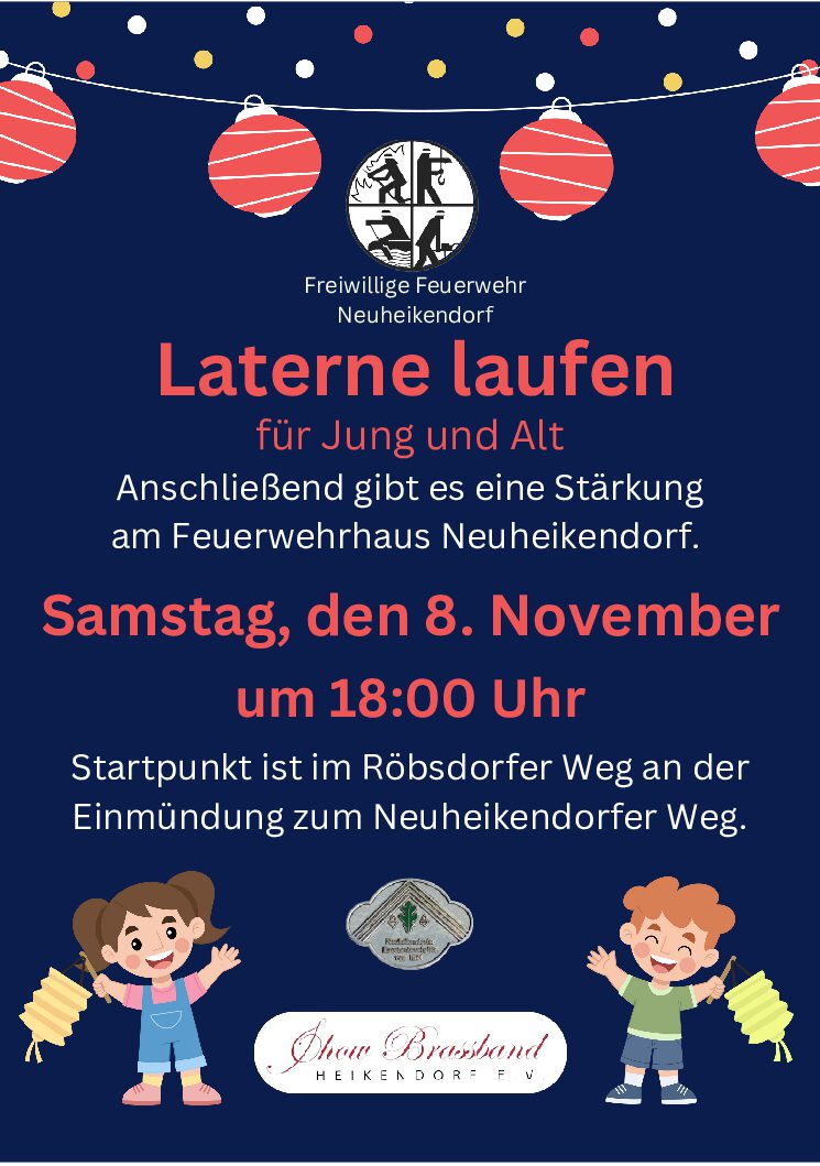 Am 8. November heißt es in Neuheikendorf „Laterne, Laterne, Sonne, Mond und Sterne.“ Gemeinsam mit der Ortsfeuerwehr Neuheikendorf, der Neuheikendorfer Knochenbruchgilde und der Jugend- und Kinderfeuerwehr geht es um 18:00 Uhr los am Startpunkt Röbsdorfer Weg – Einmündung zum Neuheikendorfer Weg.